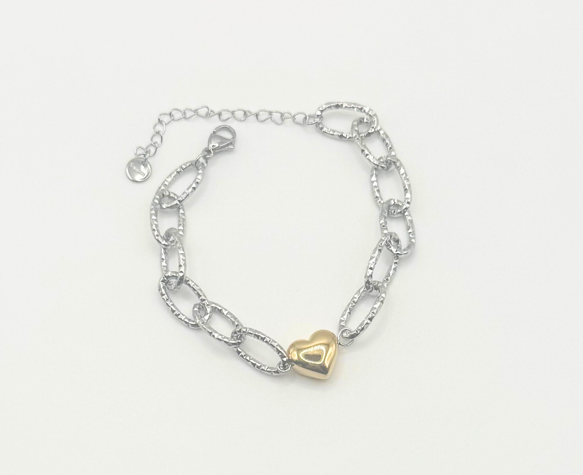 Pulsera de cadena en acero inoxidable plateado con un delicado corazón dorado al centro. Su diseño elegante y versátil aporta un toque romántico y atemporal, ideal para el uso diario o para regalar. Elaborada en acero inoxidable de alta calidad, es resistente al agua, hipoalergénica y está diseñada para conservar su brillo y belleza con el paso del tiempo.