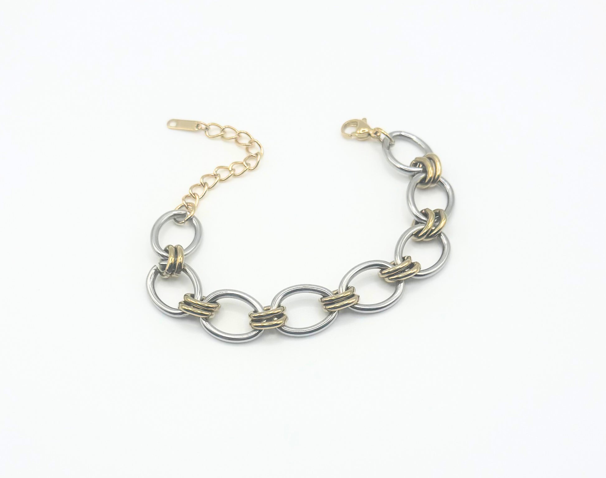 La pulsera de eslabones bicolor presenta un elegante diseño de eslabones de acero inoxidable con un refinado contraste de tonos dorados y plateados. Su estilo versátil y contemporáneo la convierte en una pieza destacada, perfecta para el día a día o para complementar looks más sofisticados.